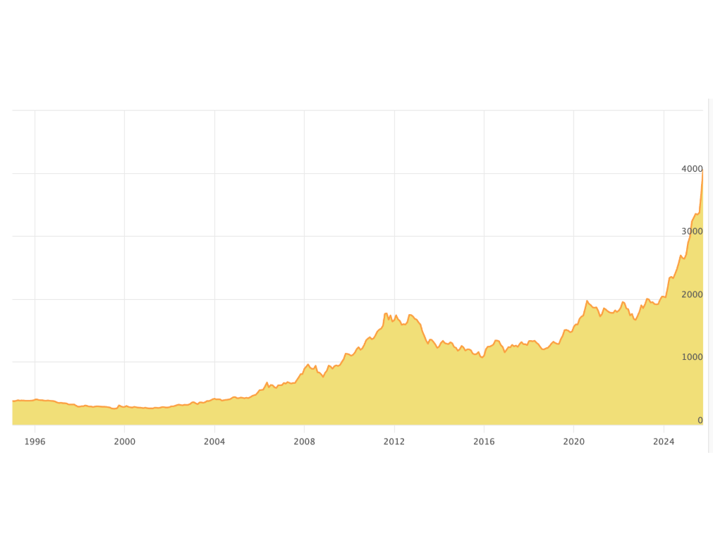 We’re talking about gold, which has recently been trading at an all-time record of $4,300 an ounce. That’s about 65% higher than the price on January 1. In the stock market, we talk about ‘market cap,’ which is the sum you get when you multiple all of a company’s outstanding shares by its current share price. If you were to multiply all the outstanding shares of Nvidia, Microsoft, Apple, Alphabet, Amazon, Meta and Tesla by their respective current share prices, and add them all together, the resulting sum would be significantly less than the $30 trillion ‘market cap’ of gold.