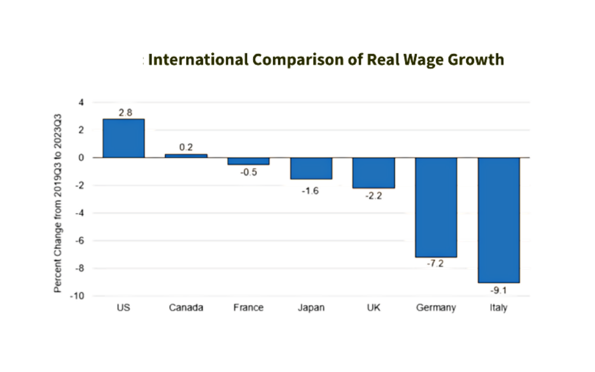 Of course, the earnings growth is only relevant for people who actually have a job. The good news is that unemployment is still down around record lows. And anything who thinks that wage growth in America lags behind the rest of the world should look at the last chart in the report, which shows that the U.S. experience is well ahead of other developed nations—most of whose workers experienced declines in real (above-inflation) wages over the same 2019-2023 time period. Instead of feeling gloomy, American workers should be celebrating gains that others can only envy.