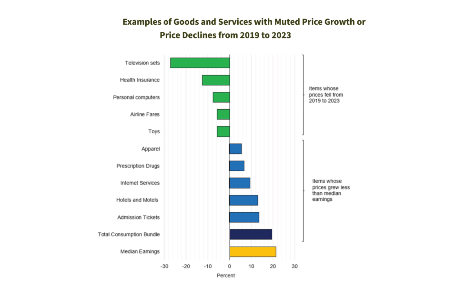There are a variety of charts in the report. One of them shows the very uneven impact of inflation in different types of goods and services. Televisions now cost almost 30% less than they did before the pandemic, and health insurance, personal computers, airline fares and toys all showed fairly significant price declines. Prescription drugs, internet services and most living expenses went up over that period, but none of them as fast as earnings.