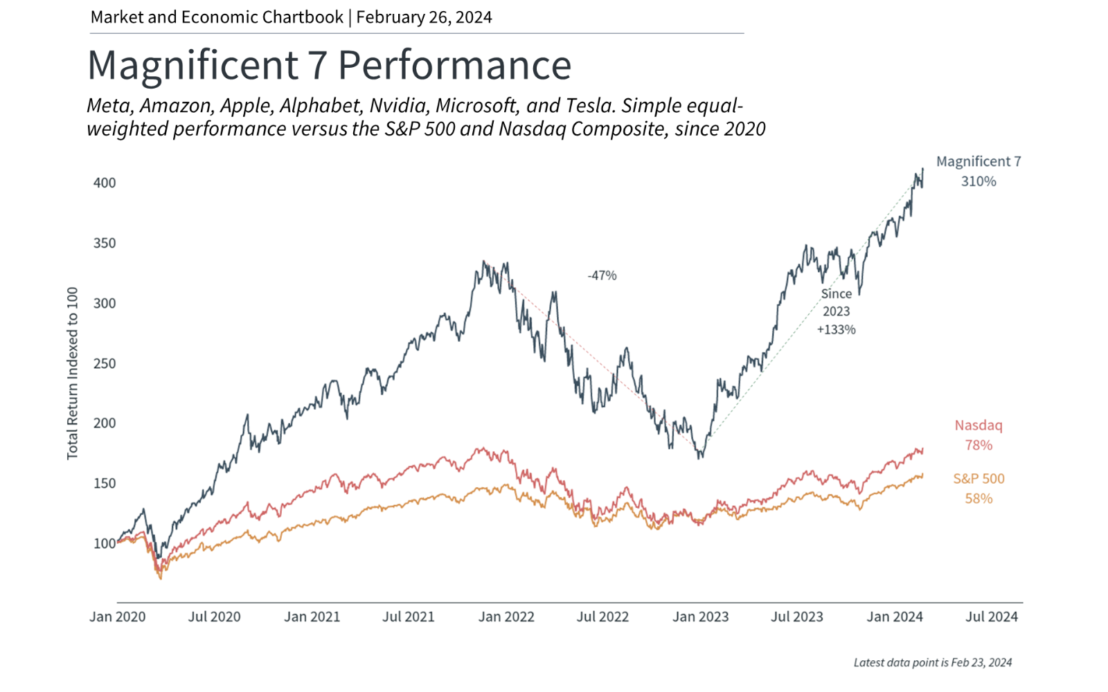 Case in point: the rally in mega cap technology stocks is an important reason to be diversified across a variety of sectors. Not only do diversified investors benefit from the returns experienced by the Magnificent Seven and the technology sector more broadly, but they also protect their portfolios from downside risk and position themselves to take advantage of growth in other parts of the market. As all investors know, past performance is no guarantee of future returns. Investors with long time horizons ought to remain balanced across a variety of sectors and styles that are tied to trends in the underlying economy.