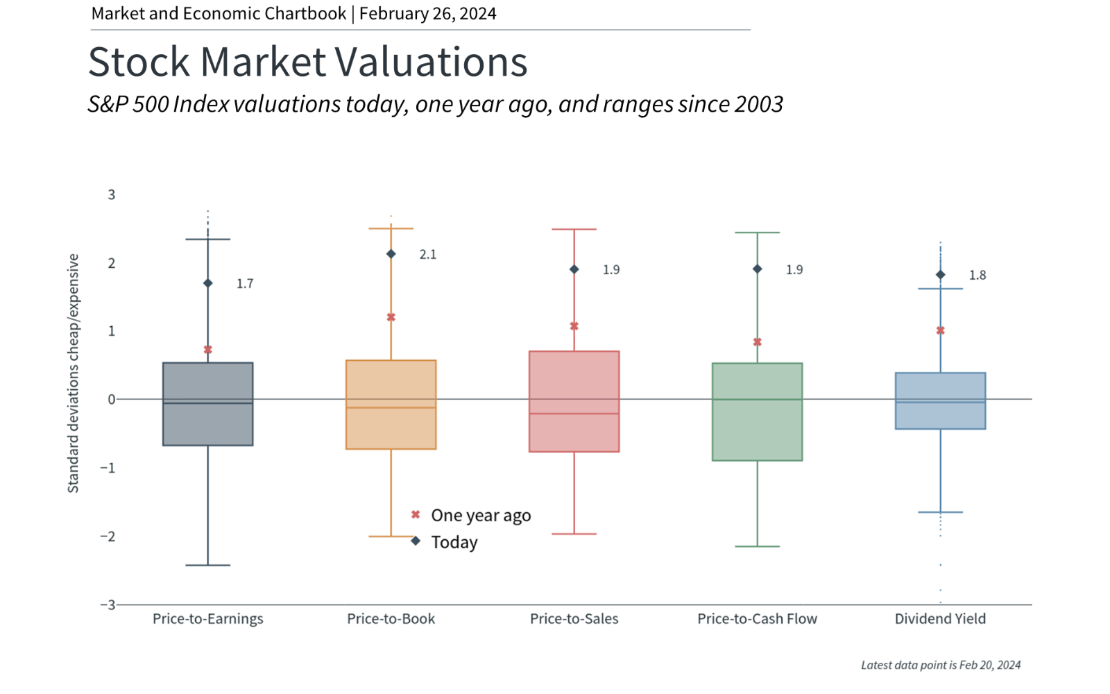 However, valuations are neither market timing tools nor do they explain all market movements. Instead, they are simply guideposts that can help investors determine appropriate asset allocations based on their financial goals. As the accompanying chart shows, most valuation measures are now well above their long run averages including price-to-book, price-to-sales, dividend yield, and more. This is partly because the underlying fundamentals are still catching up with the market rally. As sales grow, earnings improve, and interest rates stabilize, valuations could begin to improve as well. Thus, higher valuations are not a reason to avoid stocks but are instead a reminder to focus on diversifying both within the stock market as well as across asset classes.