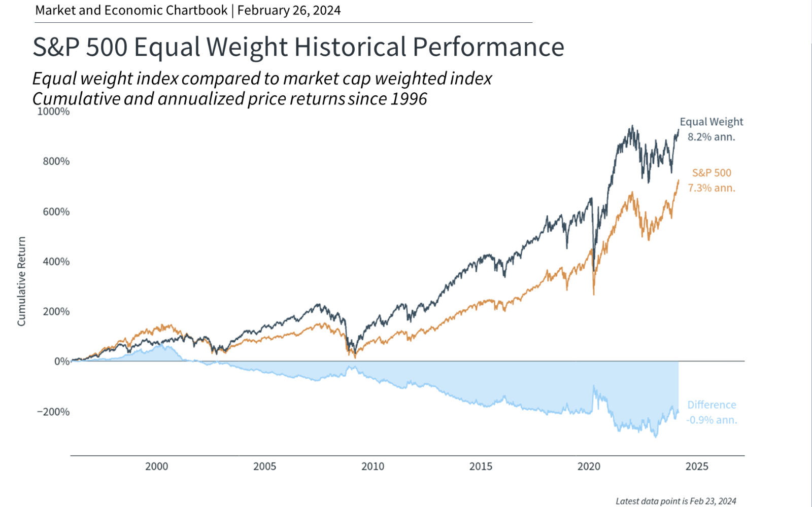 Beyond today's valuations and returns, another concern that some investors have is that a small group of companies is having an outsized impact on the overall stock market. Perhaps the simplest way to see this is to compare the standard S&P 500 index, which places a weight on each stock based on its size, to one which gives an equal weight to each stock. Both weighting methods are useful in different ways: using market cap weights provides a more accurate sense of the composition of the stock market - i.e., where the dollars are. Using equal weights helps investors to benefit from a broader base of companies to naturally diversify.